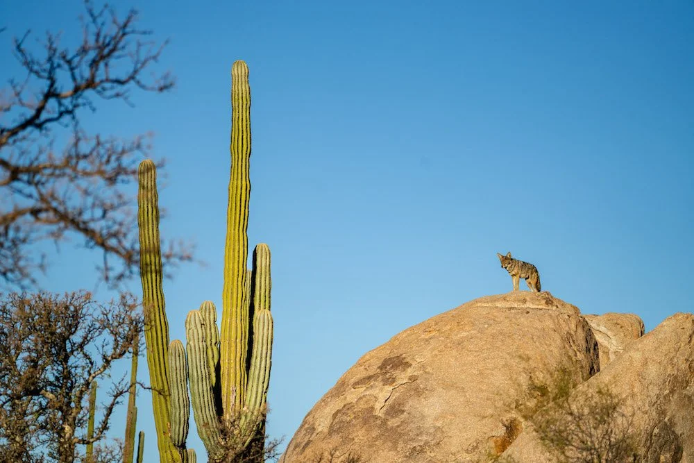 A coyote, who patrolled the lands around our campsite, watching over us and the landscape of Catavina from a rock perch. Photo by Dalton Johnson
