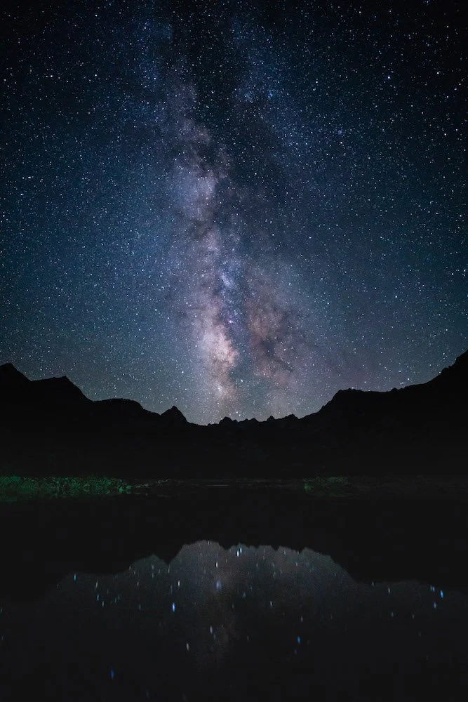 The milky way reflects in Lake Sabrina while taking astrophotography in the Eastern Sierra. Photograph by Dalton Johnson
