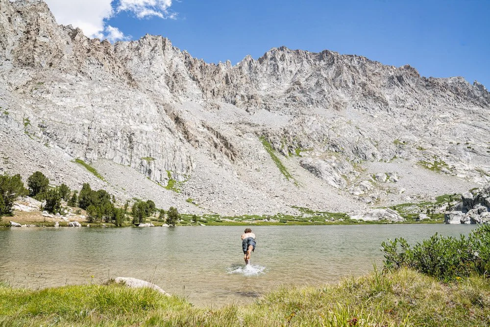 Diving into a brisk lake with the Evolution Range in the background while hiking the North to South Lake Loop. Photo by Dalton Johnson