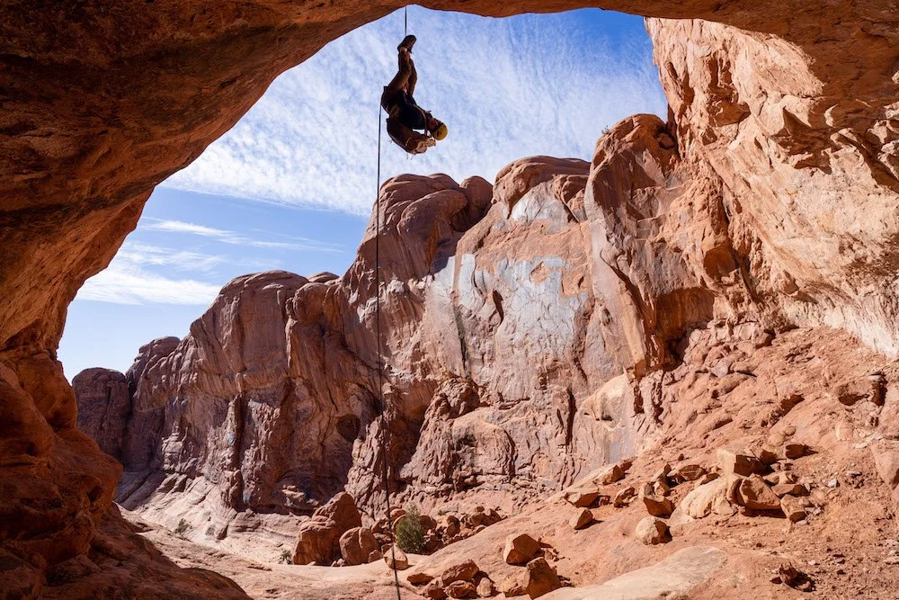 A massive rappel from the center of Hourglass Arch to set up a rope swing near Moab, Utah. Photograph by Dalton Johnson