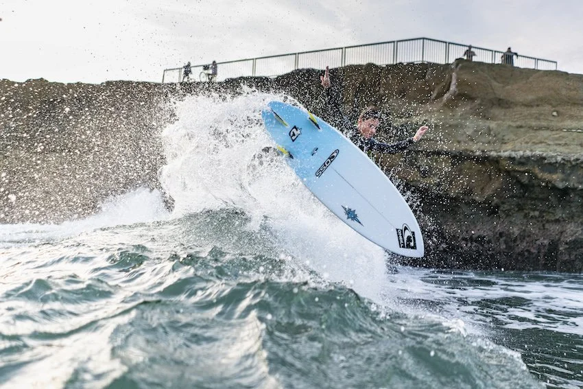 Sam Coffey airing out at Steamer Lane for the camera. Photograph by Dalton Johnson