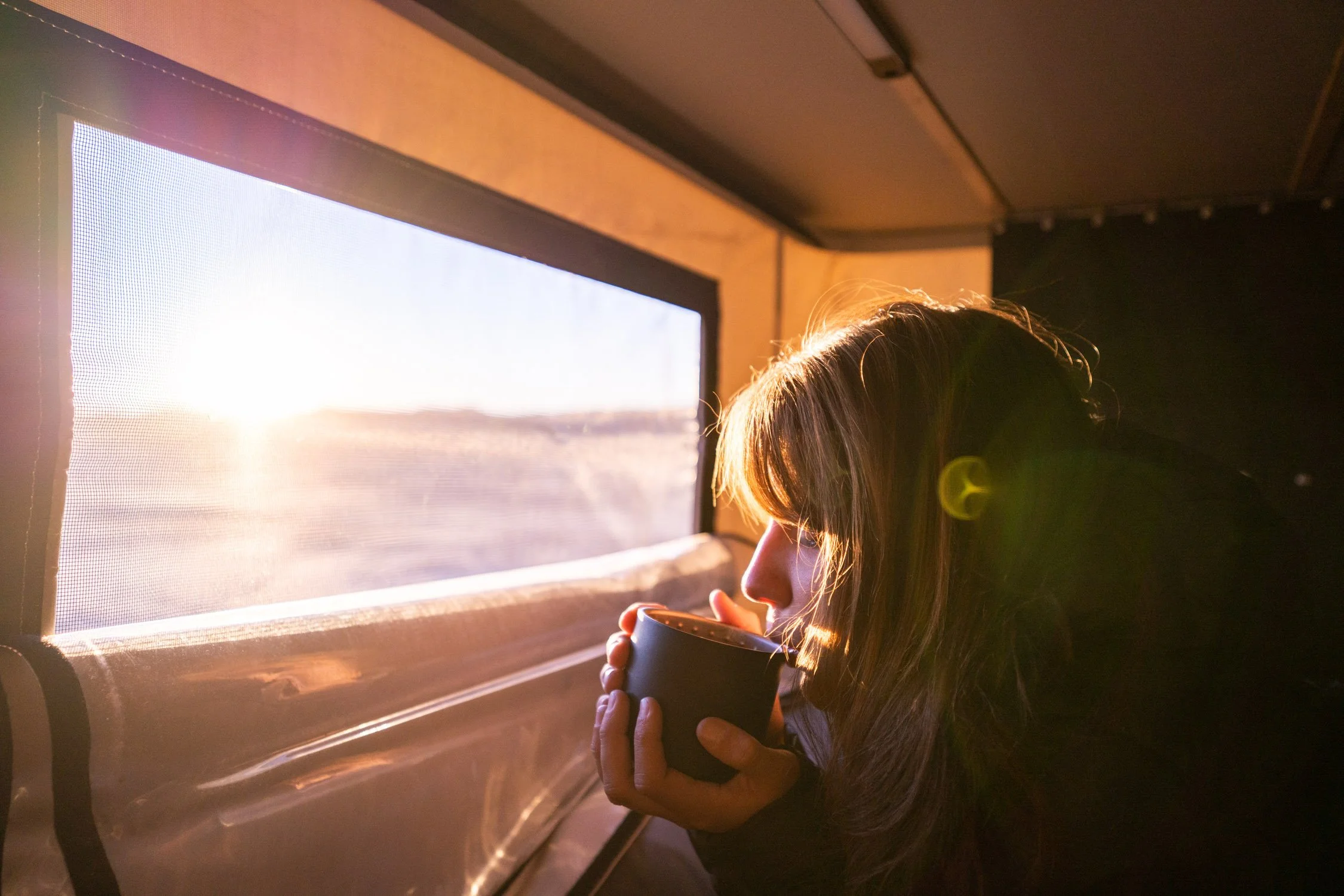 While on a rock climbing road trip to Joshua Tree National Park in California, Kristin enjoys her morning cup of coffee in her Four Wheel Camper adventure mobile. Photograph by Dalton Johnson.