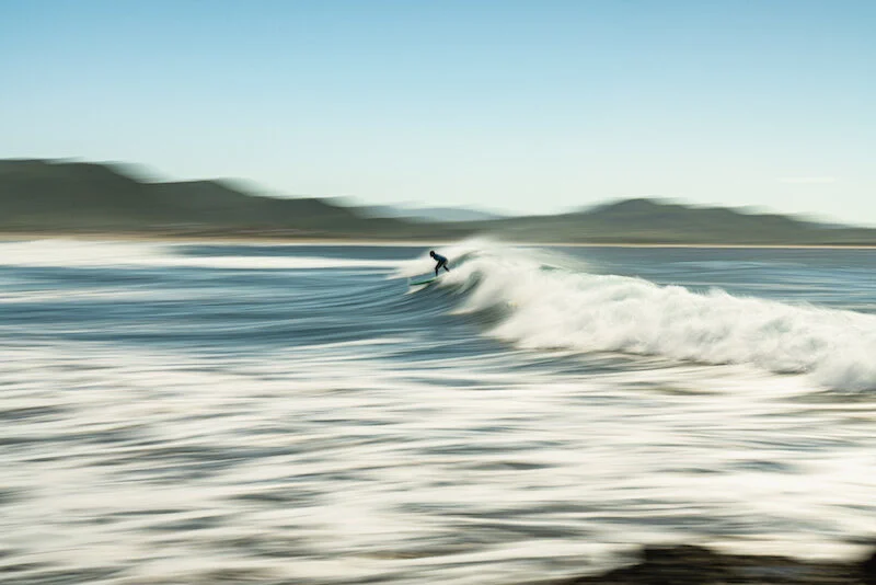 A motion blur photograph of a surfer catching a wave at Cerritos Beach. Photograph by Dalton Johnson