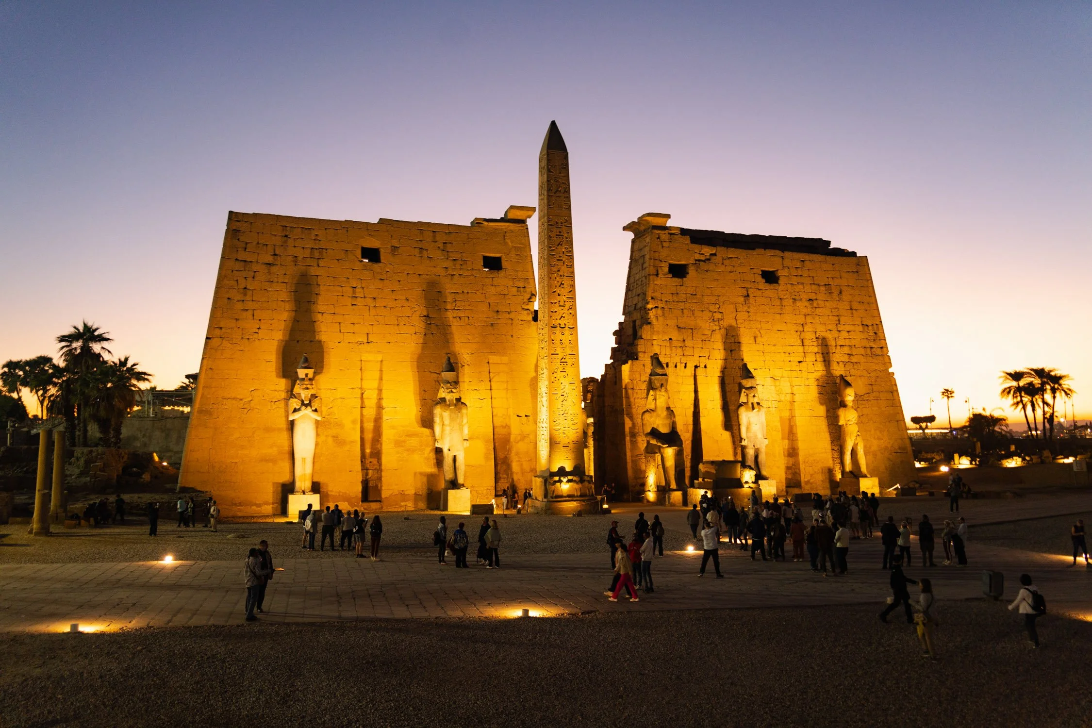 The Luxor Temple glowing at sunset and lit up with lights for a night time tour. Photo by Dalton Johnson