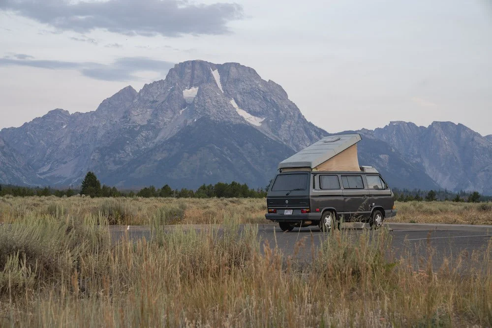 A van-lifer enjoying the views of Mount Moran while sleeping in a remote pull out. Photograph by Dalton Johnson