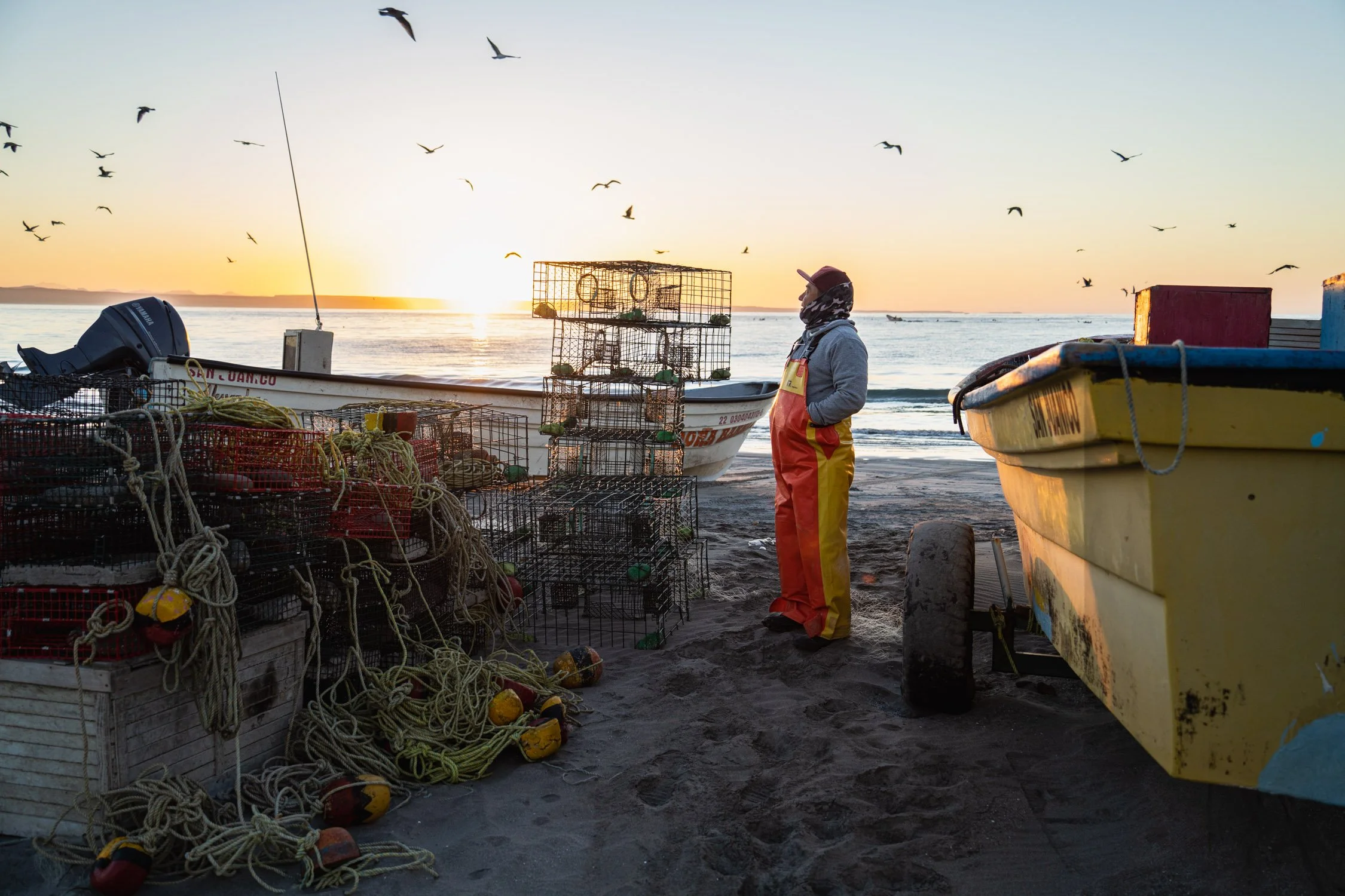 Little did I know that by sticking around I would get in with the local fisherman and have the opportunity to join them one cold morning with my camera. Loaded up in a boat, there were four of us, lobster pots, and squid pots. Heading out onto the Pacific Ocean in this little panga was crazy! I mean, the four of us worked around each other all day long as we pulled in lobster and squid. Working to keep the boat balanced, we reeled in lobster pots. Some were empty and some were full.