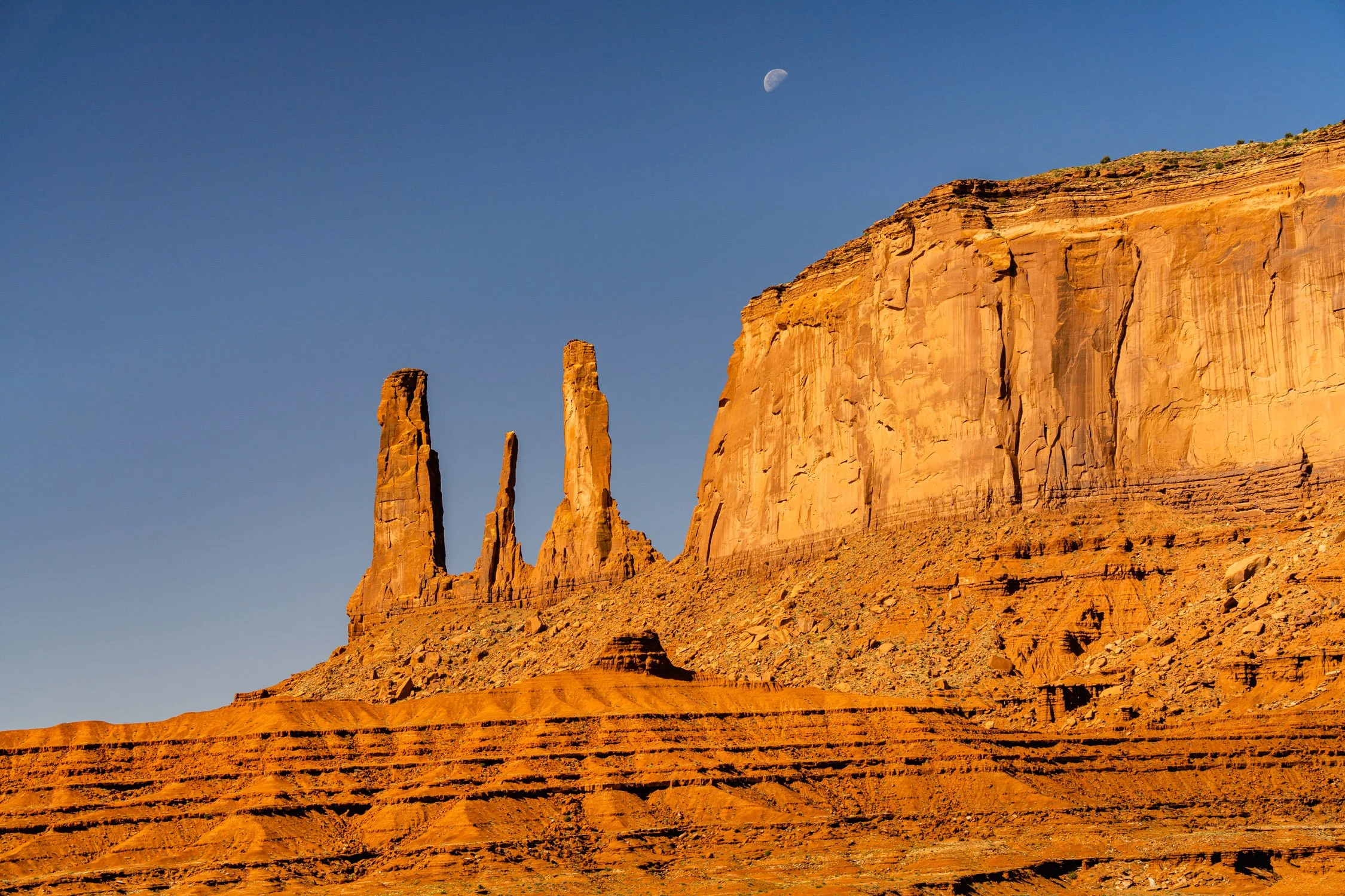 The Three Sisters standing tall on the horizon of Monument Valley glowing in the morning sun. Photo by Dalton Johnson