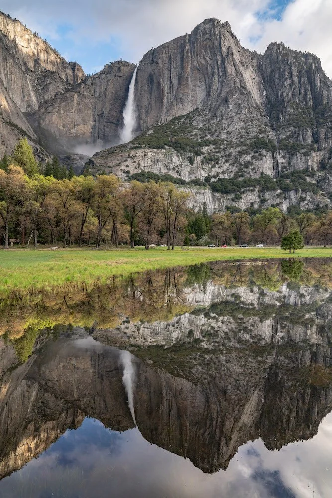 Yosemite Falls reflecting in a seasonal pool of flood water during in Cook Meadow. Photograph by Dalton Johnson